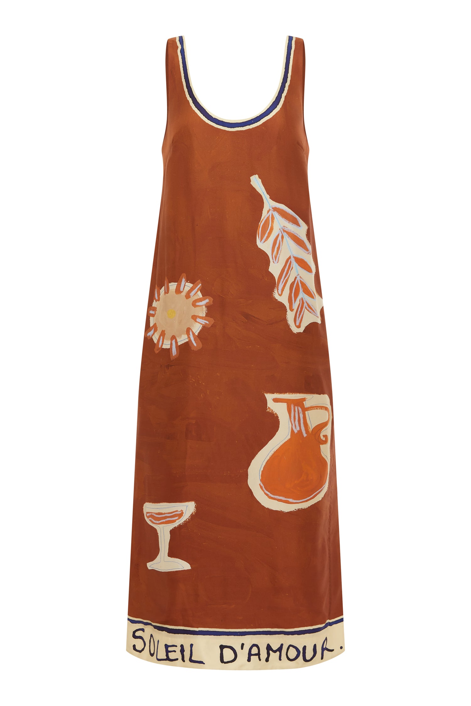 | Artwork in collaboration with Laurence Leenaert Relaxed straight midi dress silhouette Scoop neck Button and loop closure at centre back Self-covered rouleau belt included |