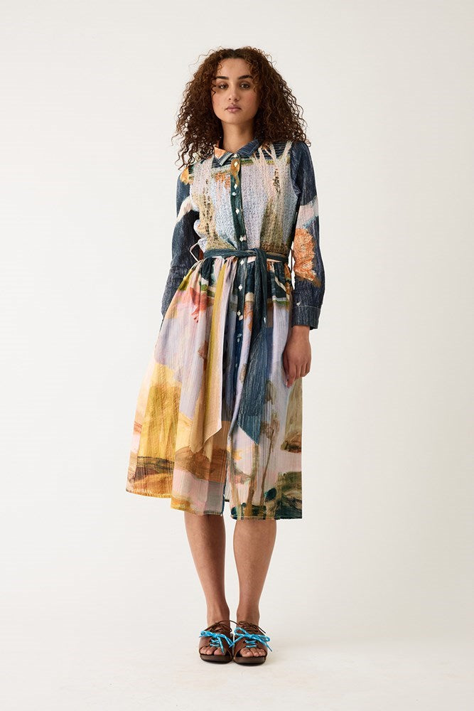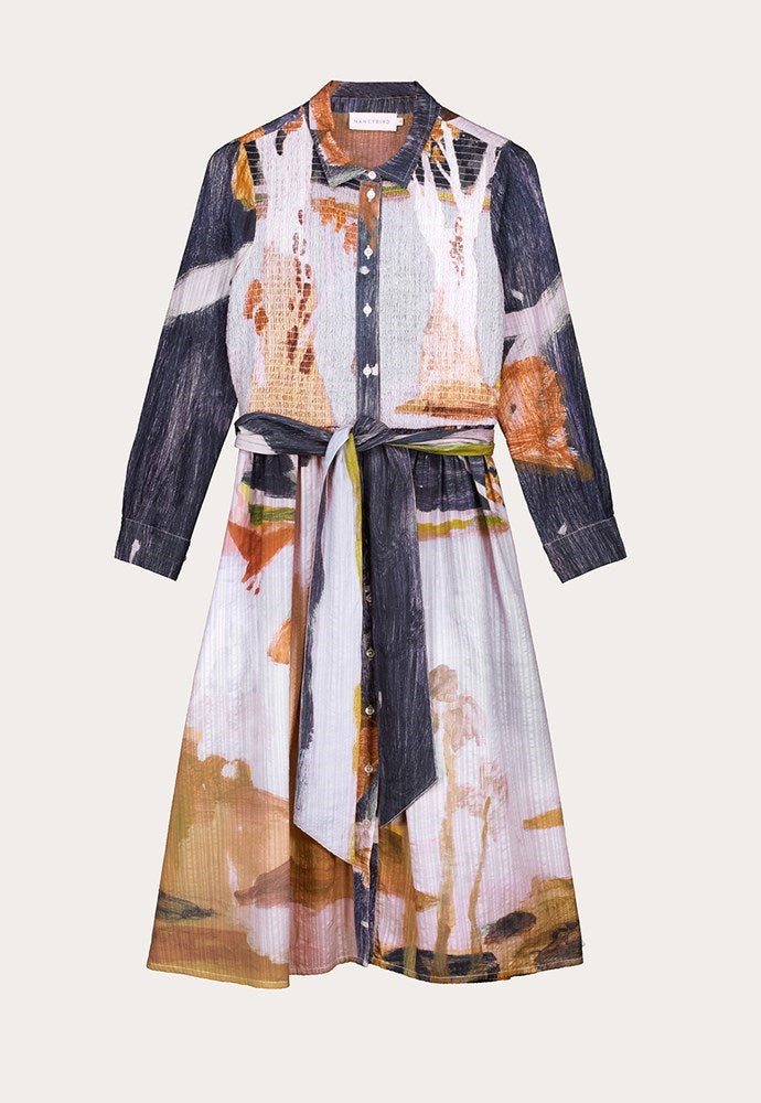 Combining classic shirt styling and delicate shirring the Delphi Dress featuring the artwork of Wendy McDonald is striking and wearable.