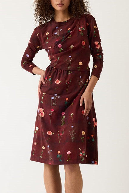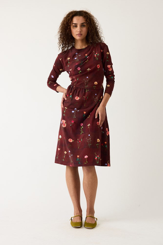 In soft organic cotton elastane and featuring the delightful Bloom Tile artwork, the Elena Dress with pleat and gathering details creates interest while providing a flattering fit.