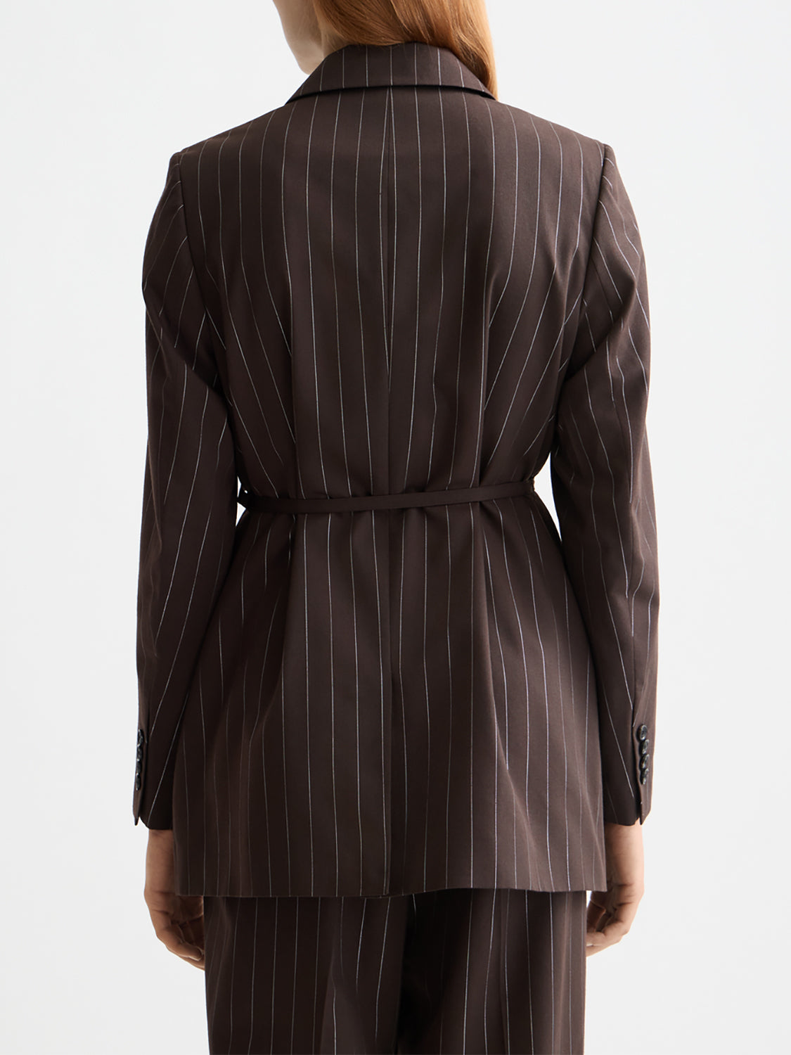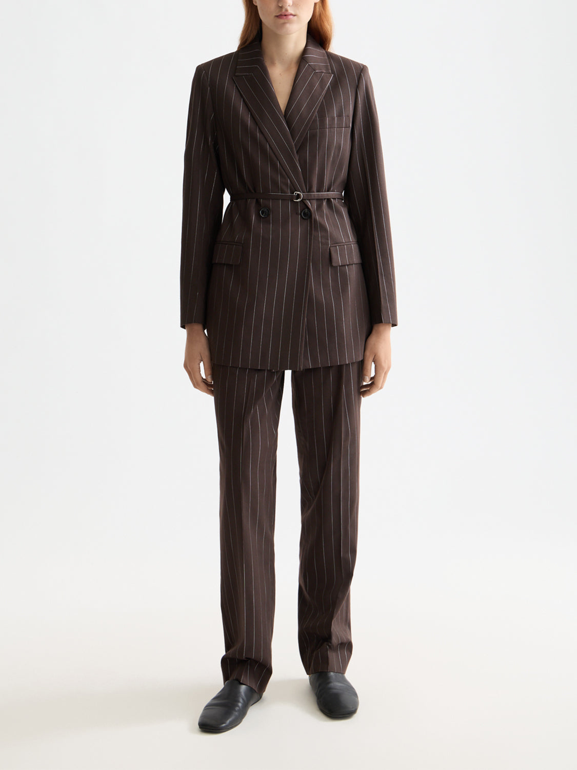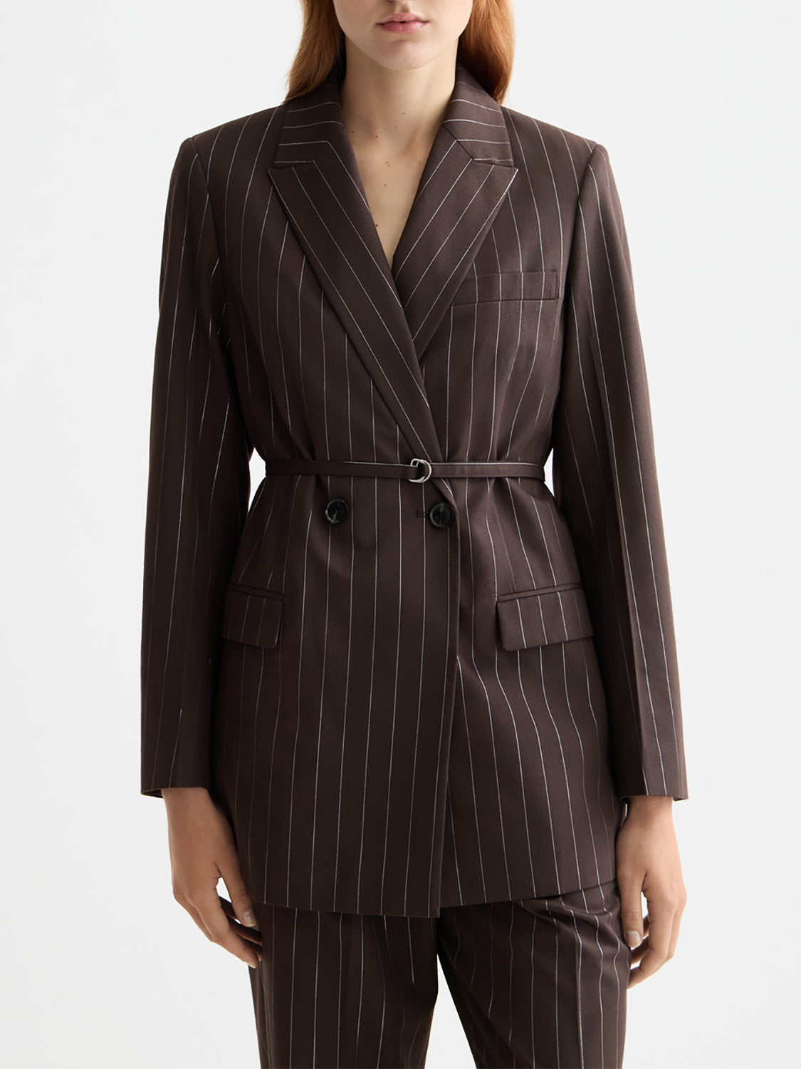 This double-breasted blazer delivers sharp tailoring with a modern twist - elevated by lurex pinstripes that add refined texture and subtle shimmer. Finished with a thin waist belt, it offers a cinched silhouette that balances structure with feminine shape.