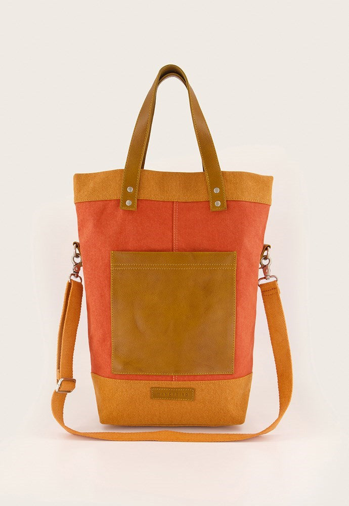 A thick organic cotton canvas bag featuring a bold orange red with rust orange contrasts. The straps can be worn multiple ways to fold the tote in half or be worn at full length.