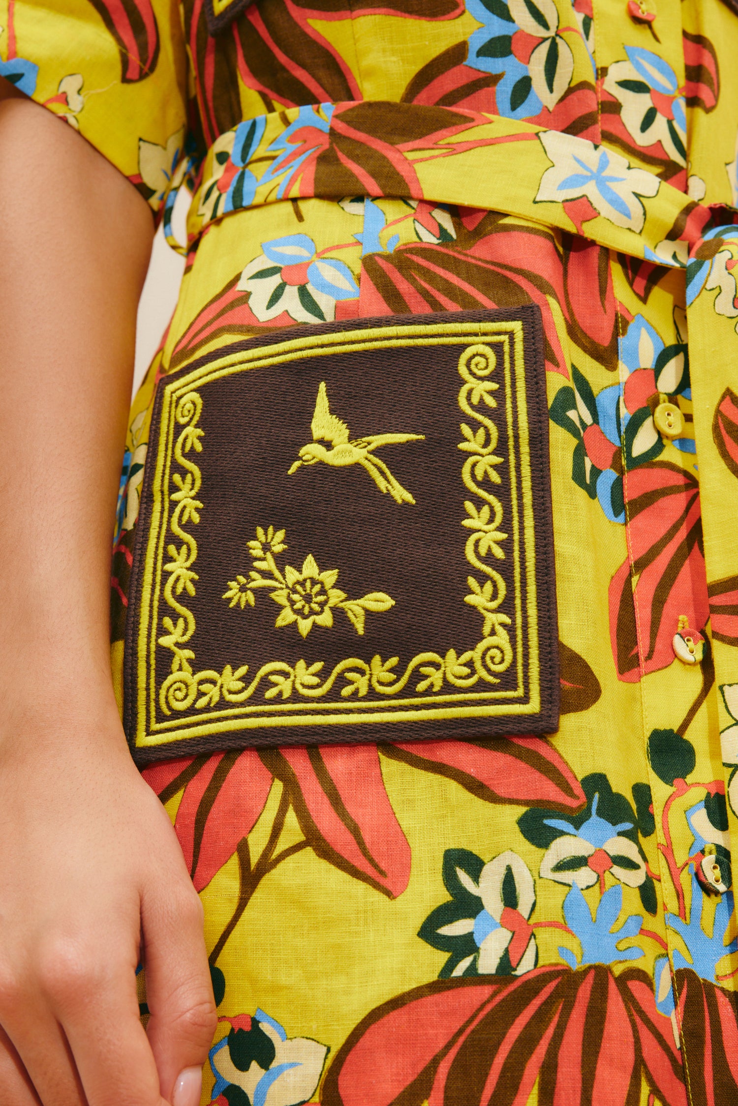 Contrast embroidered patch pockets at hips