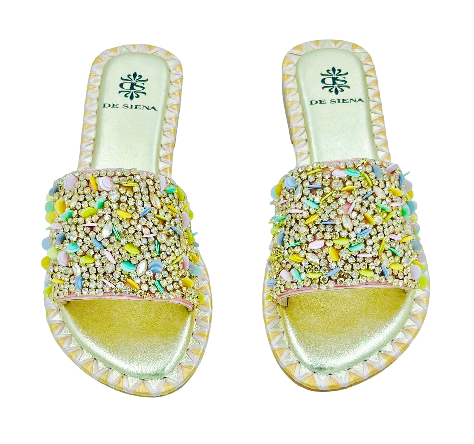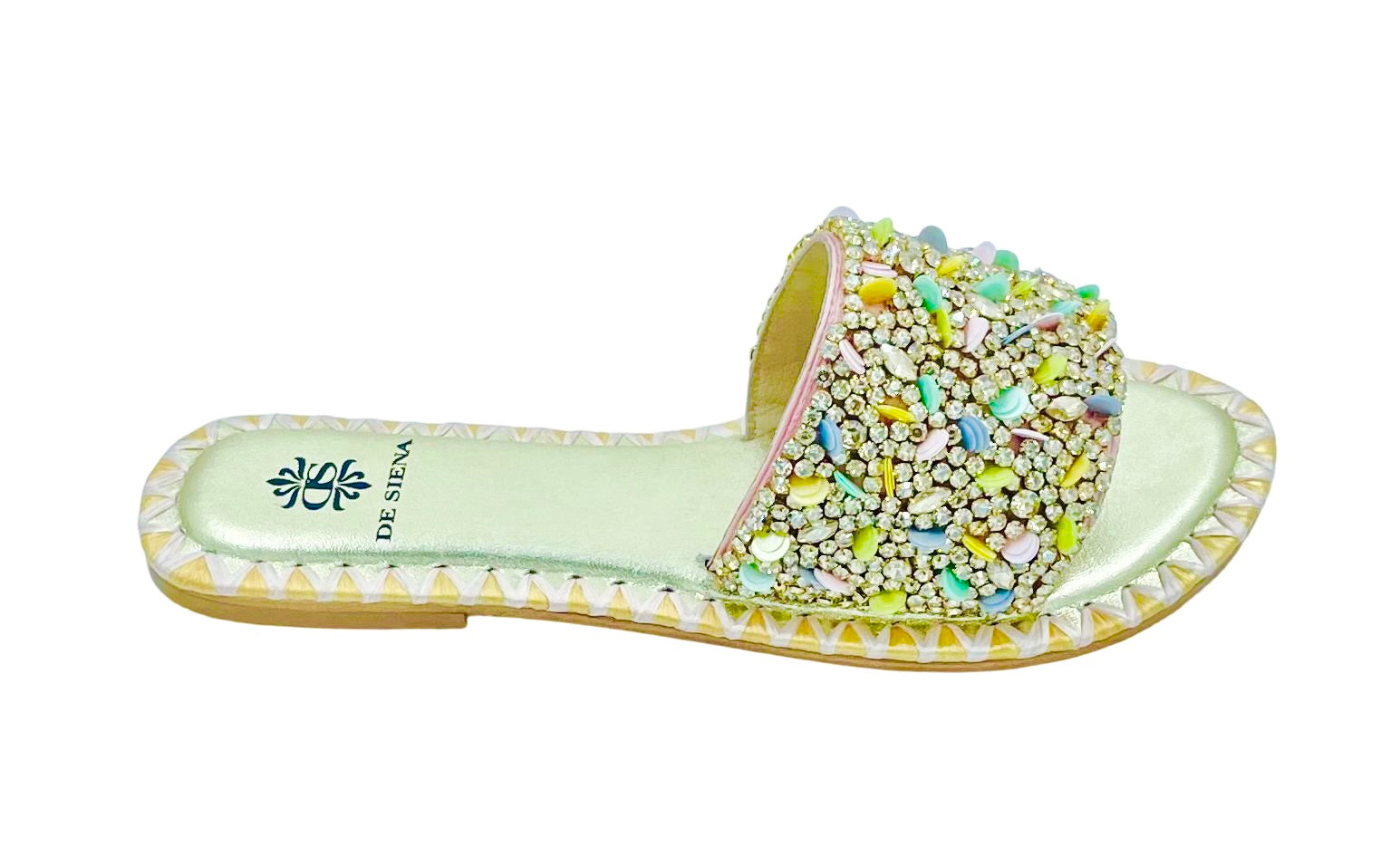 These dazzling slides are sure to brighten your mood. Sparkling beads paired with shimmering silver leather make them perfect for glam summer nights.