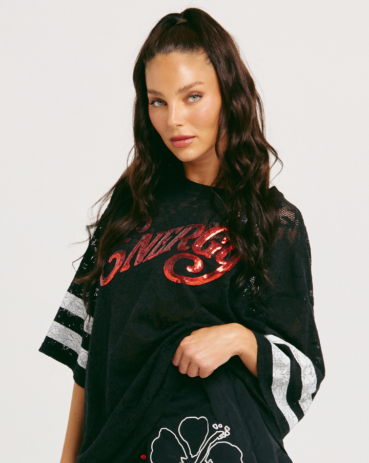 Make a statement in the Sabbi Big Energy Lace Tee—a bold, unapologetic piece that demands attention. Crafted from lightweight lace with a relaxed oversized silhouette, this tee blends sporty edge with party-ready attitude. Eye-catching sequin lettering dominates the front while an impressive back graphic ensures you're turning heads from every direction. The sheer lace panels add an effortless cool factor that elevates any look. Layer it over a bralette, bikini, or cami for maximum impact. This is the top for when you're feeling yourself and want the world to know it. HUGE sizing.