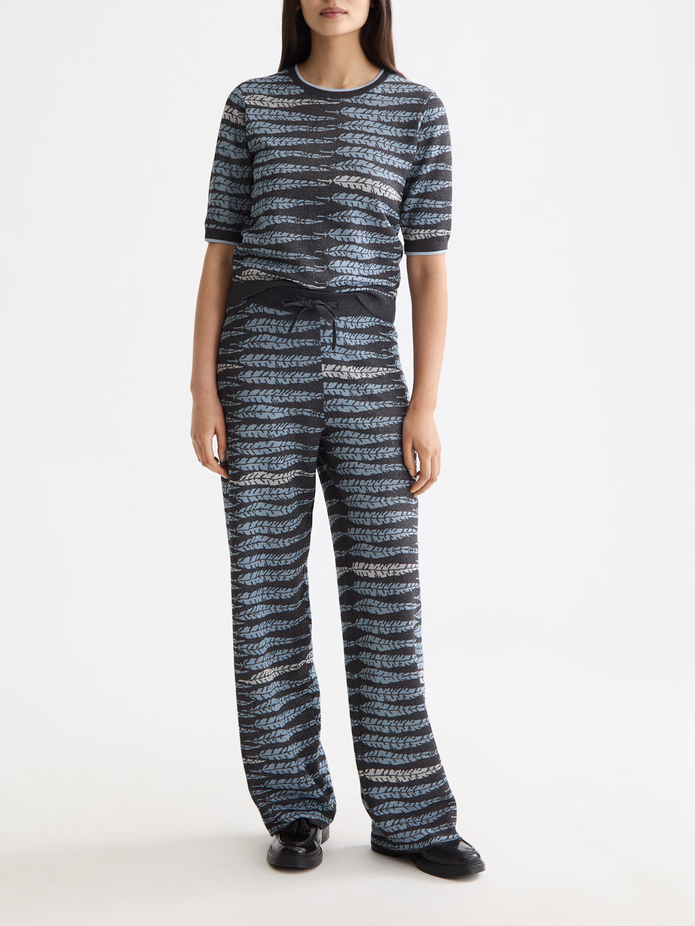 This shimmering knit tee brings retro flair into the present with its lurex jacquard weave—think vintage vibes meets contemporary edge. The glittering texture adds just enough sparkle to turn heads without trying too hard, while the classic silhouette keeps things wearable for everyday moments that deserve a little extra shine.